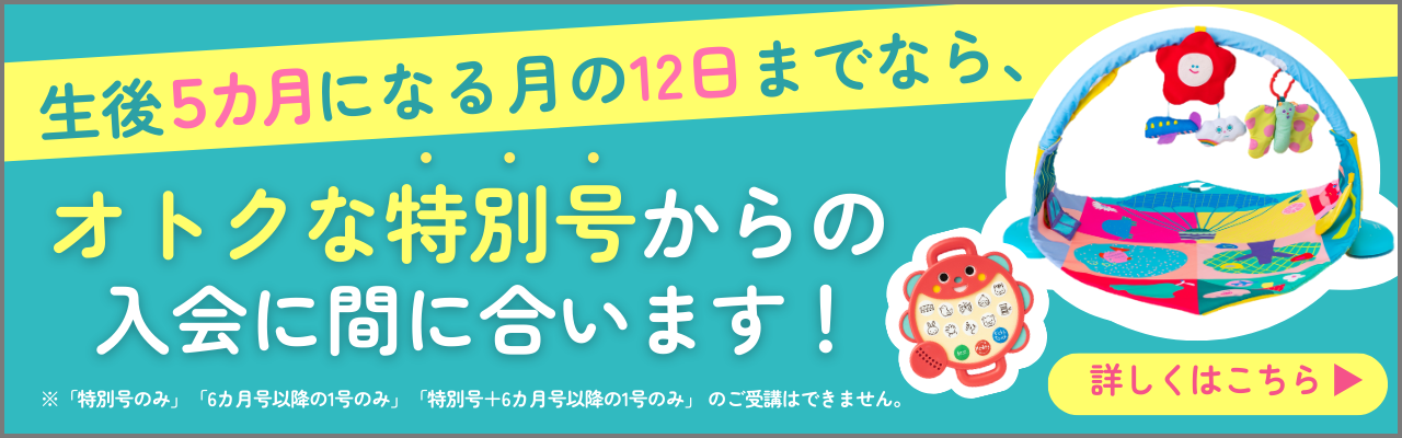 - 特別号からご入会の場合、ご利用いただくこともできます。その場合、「6カ月号」以降の受講費から割引いたします。(〈こどもちゃれんじbaby〉は「特別号のみ」「6カ月号以降の1号のみ」「特別号+6カ月号以降の1号のみ」のご受講はできません。)