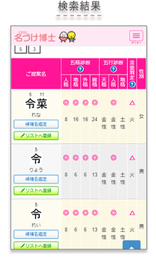 約3万件の名前データの中から「読み」「漢字」「イメージ」をヒントに候補名を検索したり、ご自身の姓とあわせて候補名を鑑定できます。
